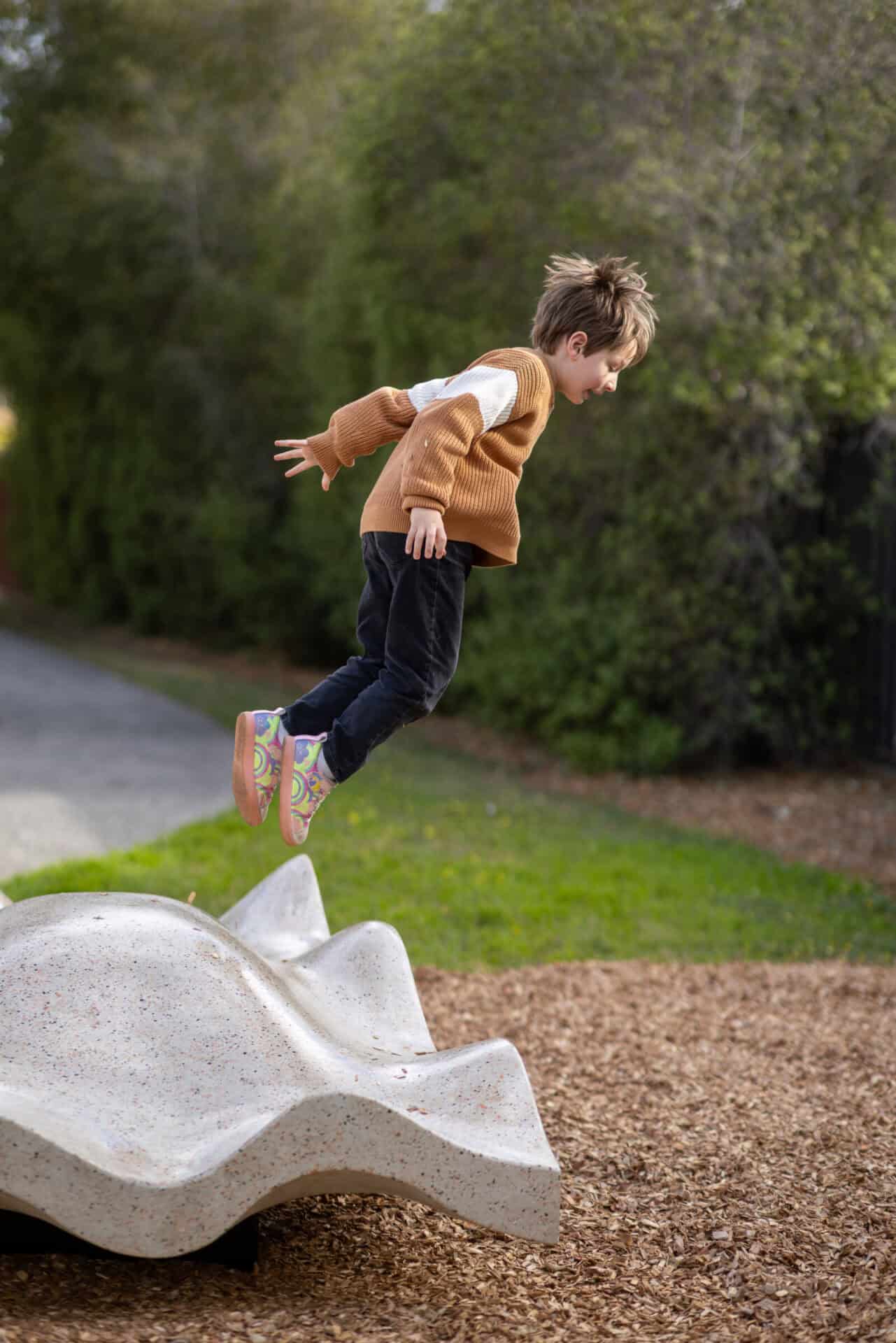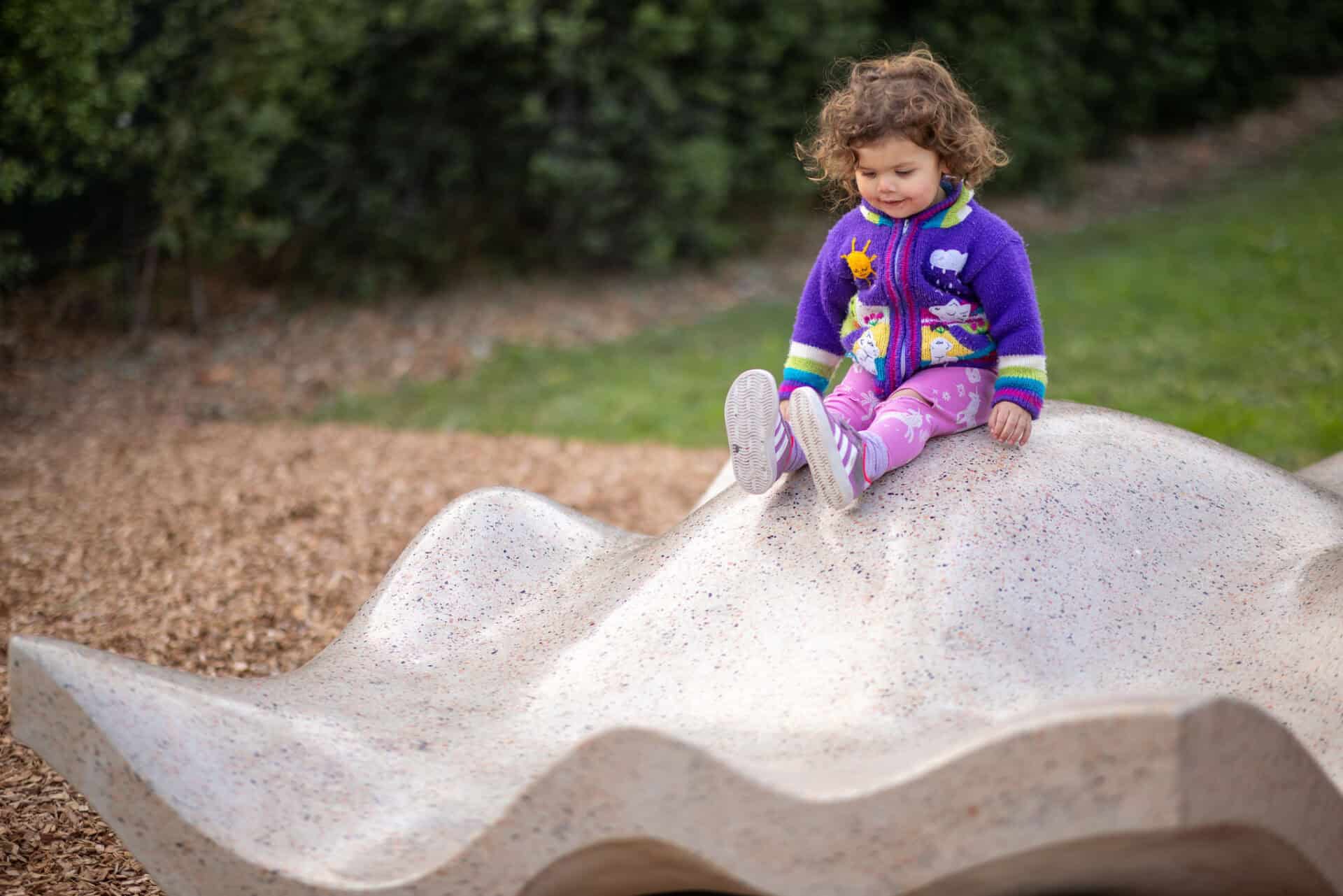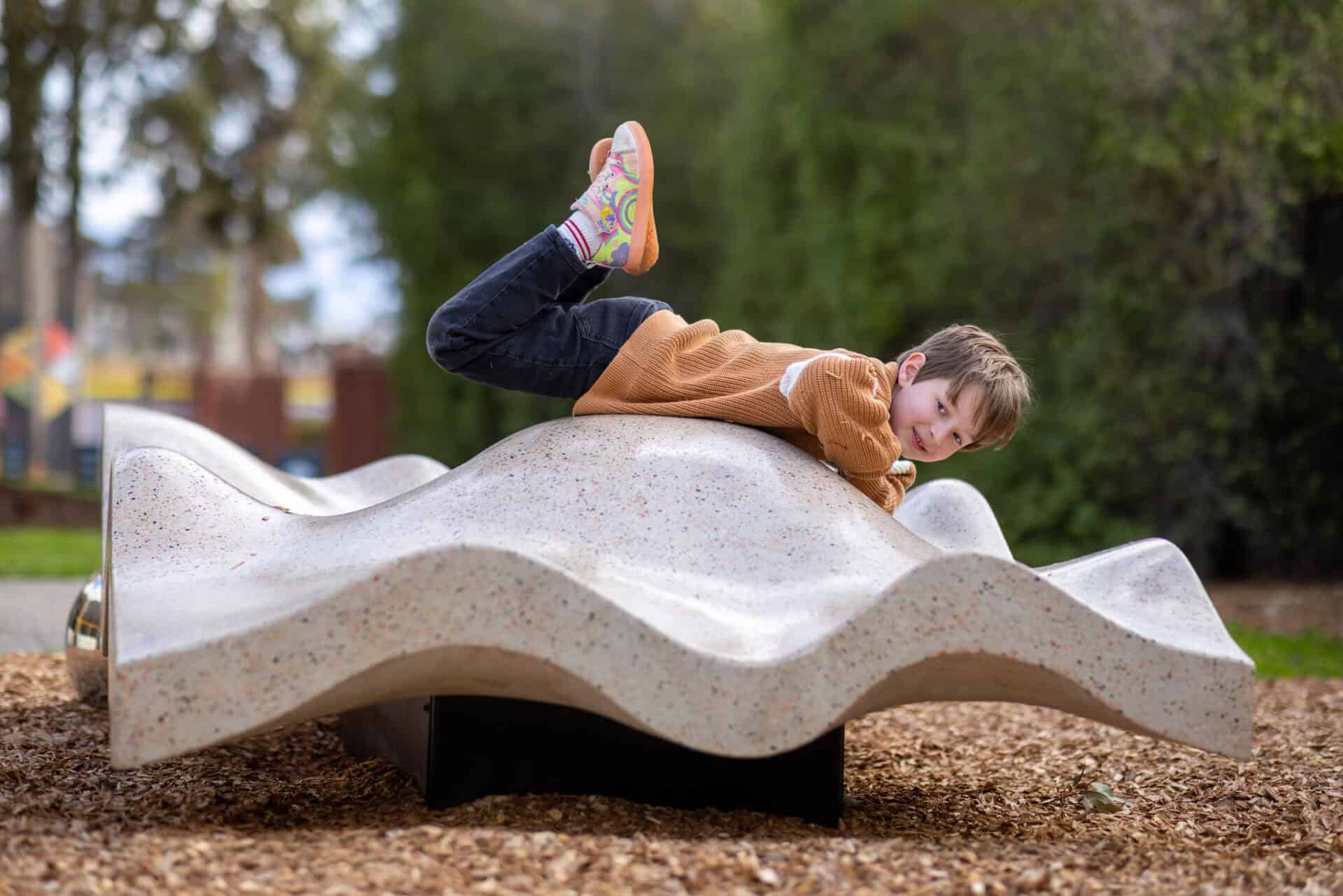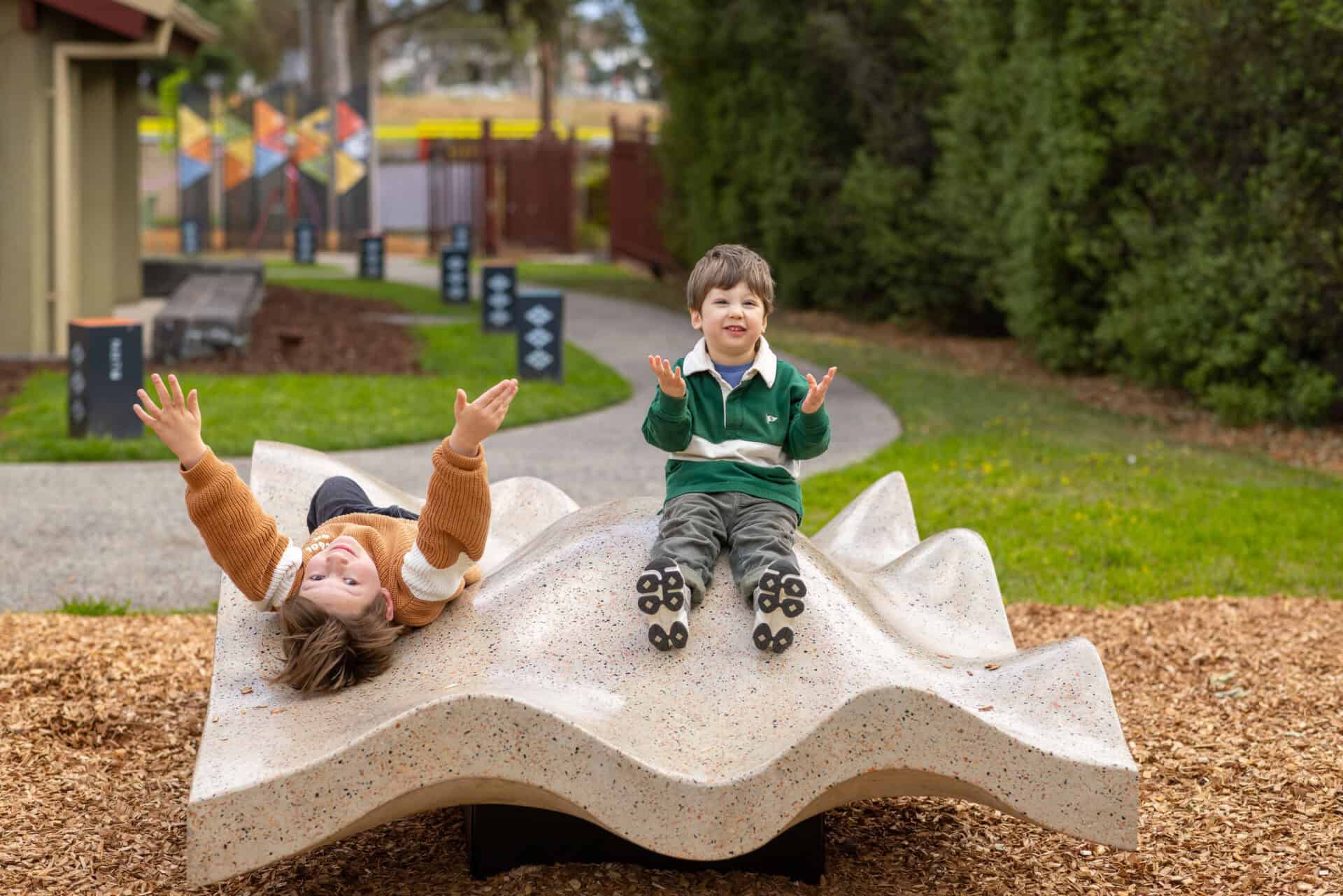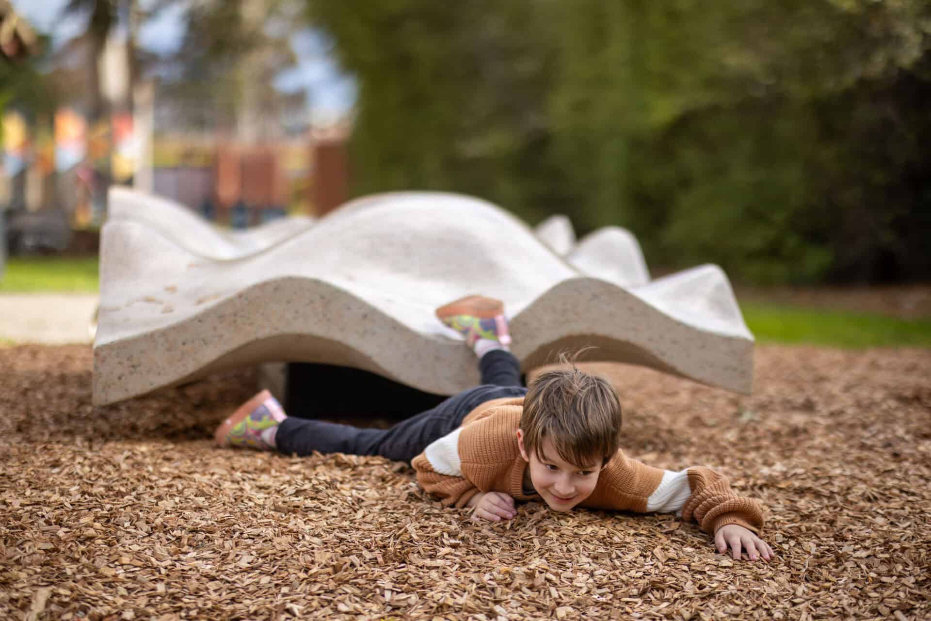 Oysters are significant to coastal and saltwater mobs and carry the history of Country in their shells – the tides, the seasons, and generations of gatherings along the shoreline. Children are invited to explore the subtle textures of this sculpture with their hands and feet, engaging their senses and imagination through direct interaction with form and story.