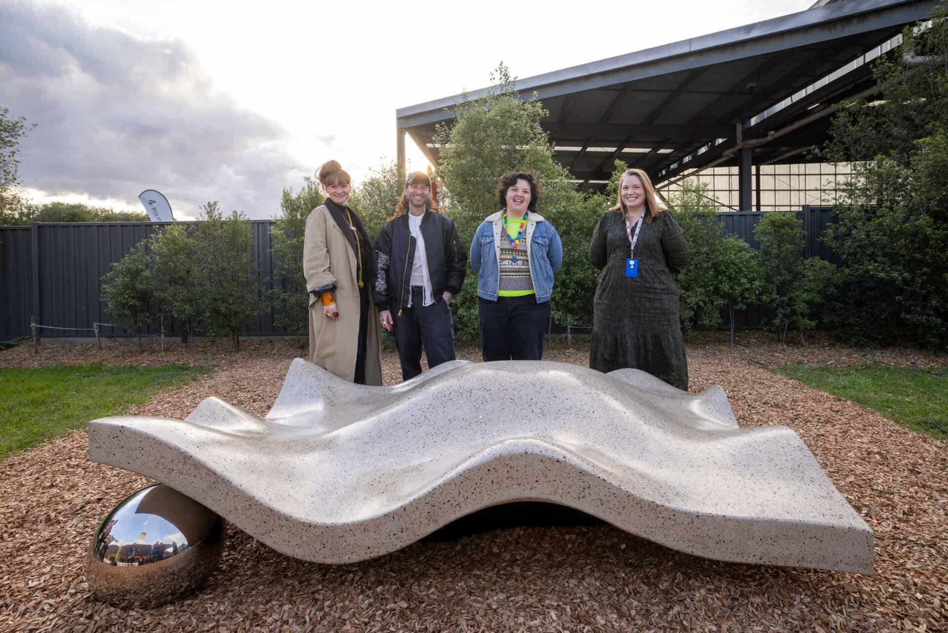 Echoing the shifting contours and underwater ecosystems of the nearby Maribyrnong River, the sculpture’s form is a land-based invitation for audiences to consider movement, storytelling, and connection to Country. Its textured surface evokes the layered pattern of an oyster shell: a symbol of sustenance, strength and deep time.