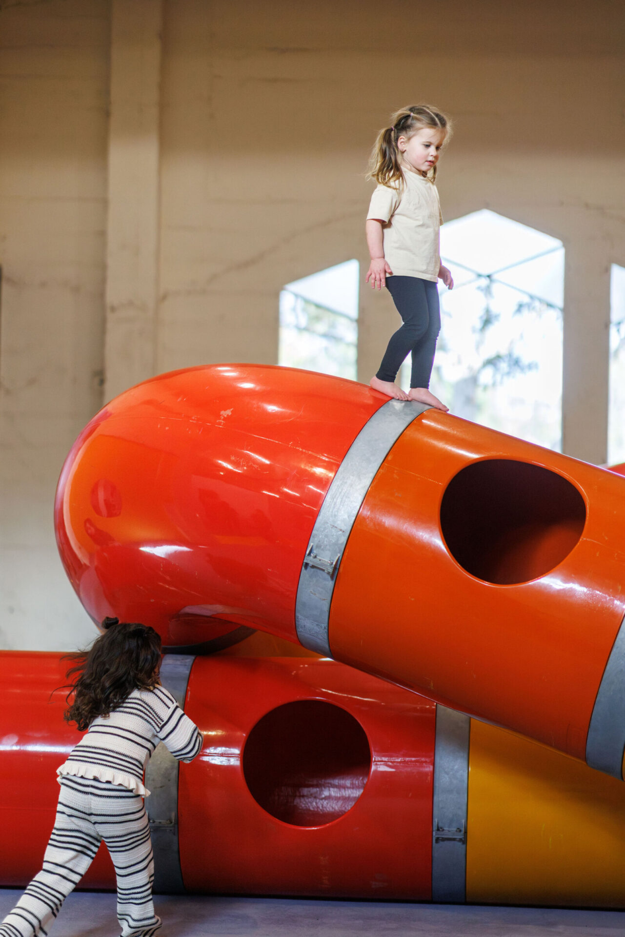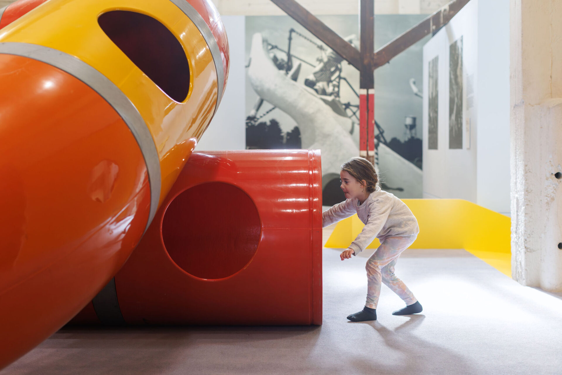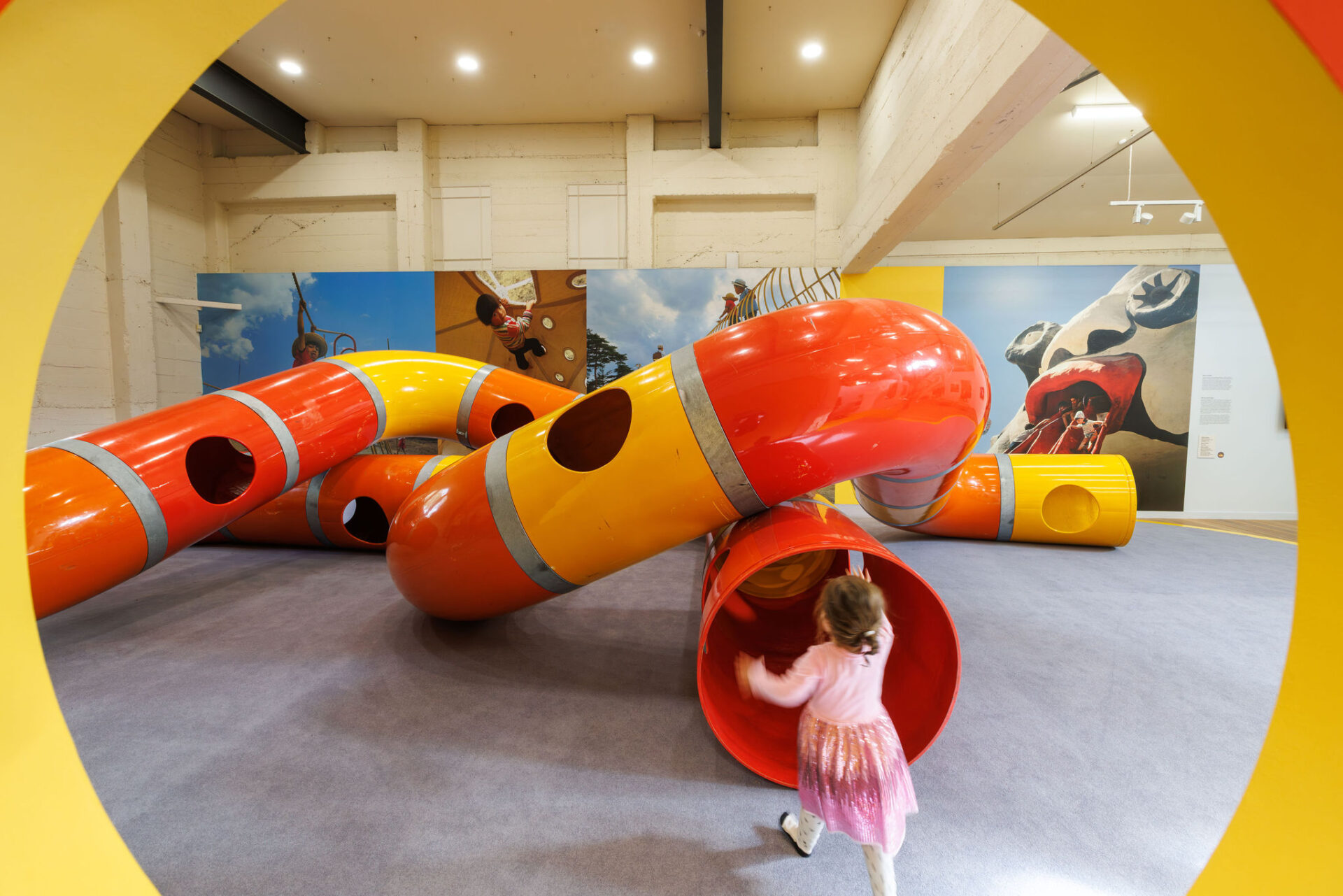 Supporting Gabriela Burkhalter’s exhibition, two indoor play sculptures welcome kids to climb, fall and imagine: The Lozziwurm (1972/2016) by Swiss artist Yvan Pestalozzi and The Brutalist Playground (2015) by Australian Simon Terrill and the UK-based design collective, Assemble.
