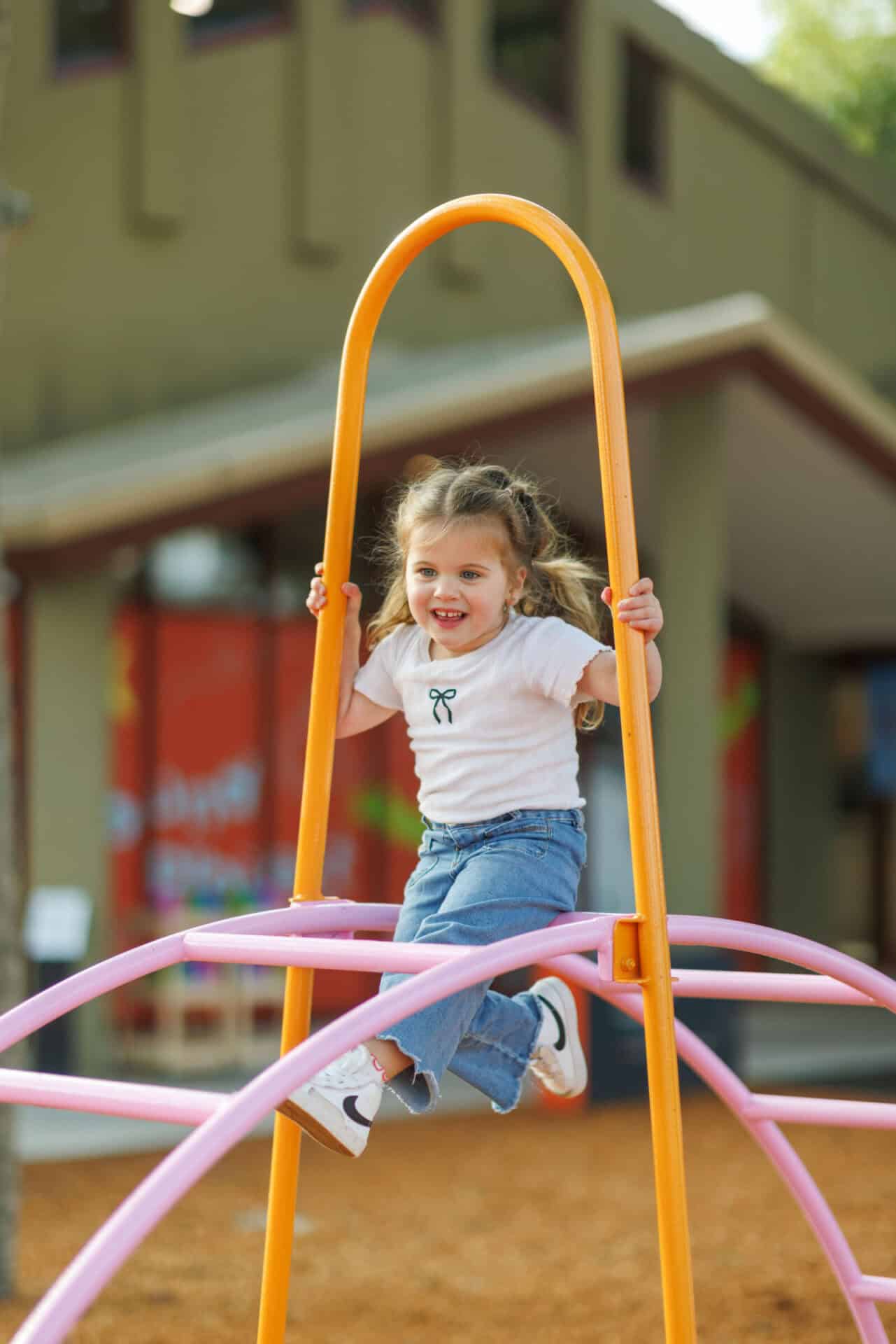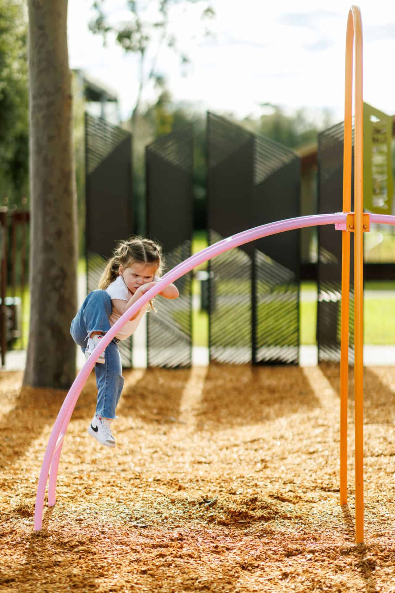Compared to local and international playgrounds of today, where risk mitigation tends to trump the opportunity for creative adventure, the monkey bar is an invitation to fun, ‘risky play’: it is a long narrow path with only three vertical hoops for hand support and often demands the management of oncoming human traffic.