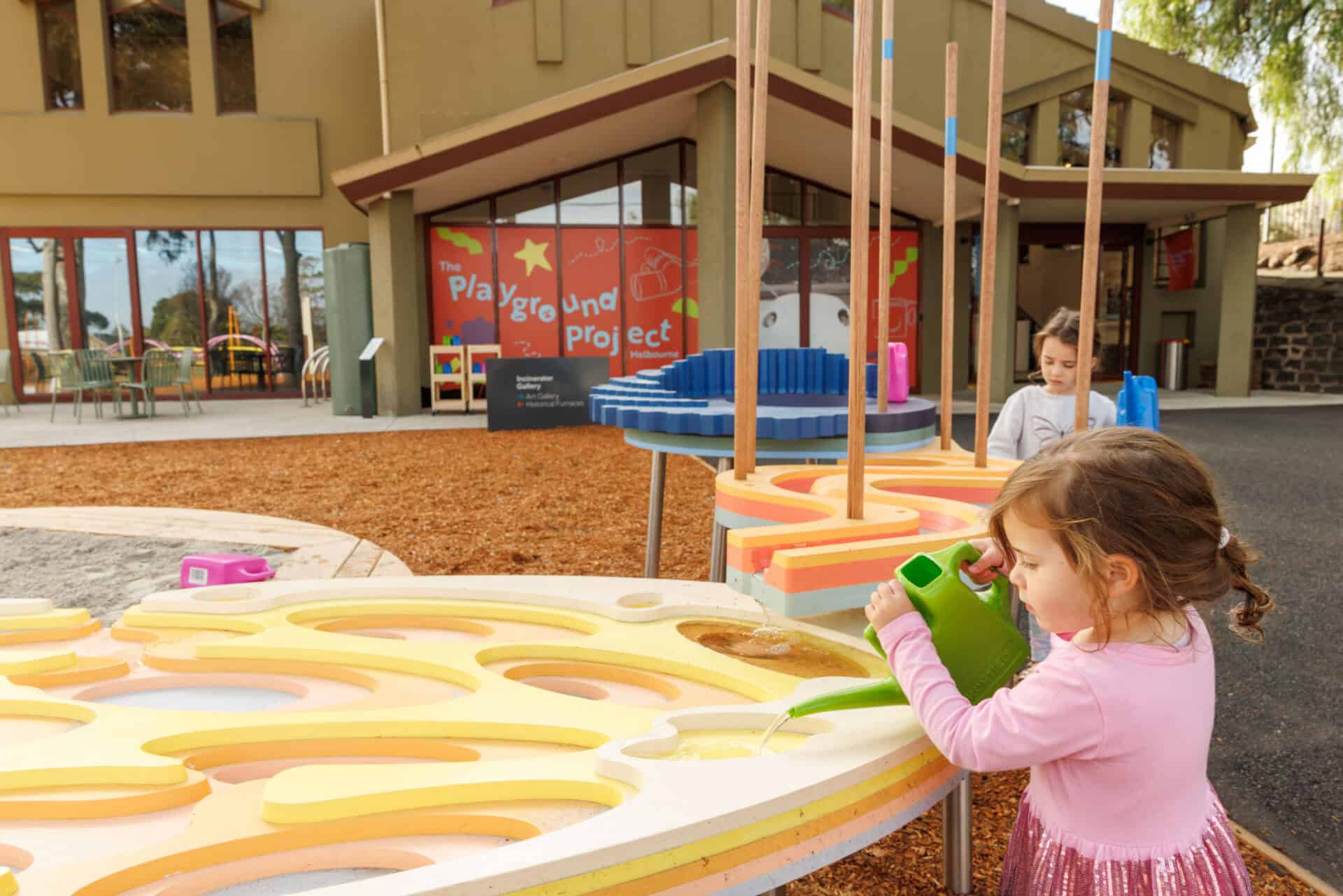 Nature play, which is an underlying theme of the headline exhibition, curated indoors by Swiss urban design and political scientist, Gabriela Burkhalter; is personified by the round wooden sand pit: echoing the architectural motifs of van Eyck and the Griffins, and nestling among Country’s lush plant and animal life. It is positioned next to a colourful 3-D printed water table realised in the shape of the Maribyrnong River, which is located a few minutes’ from the gallery.